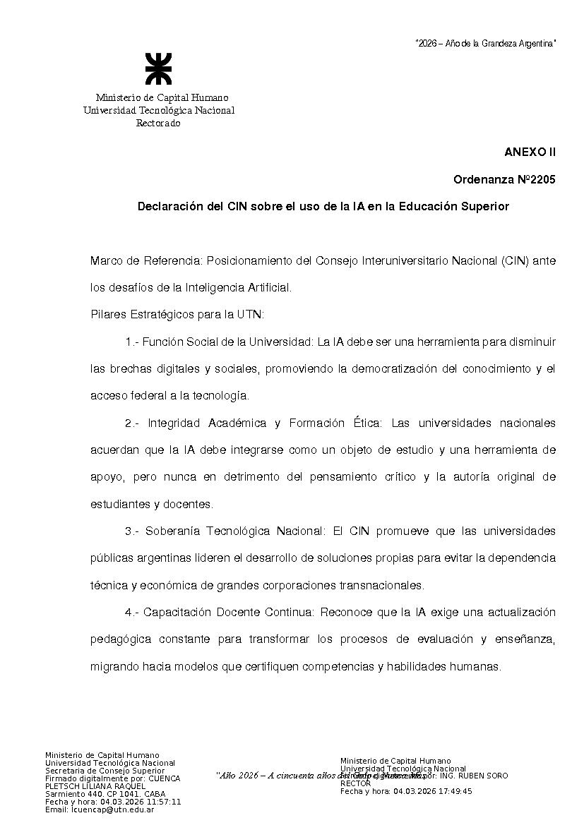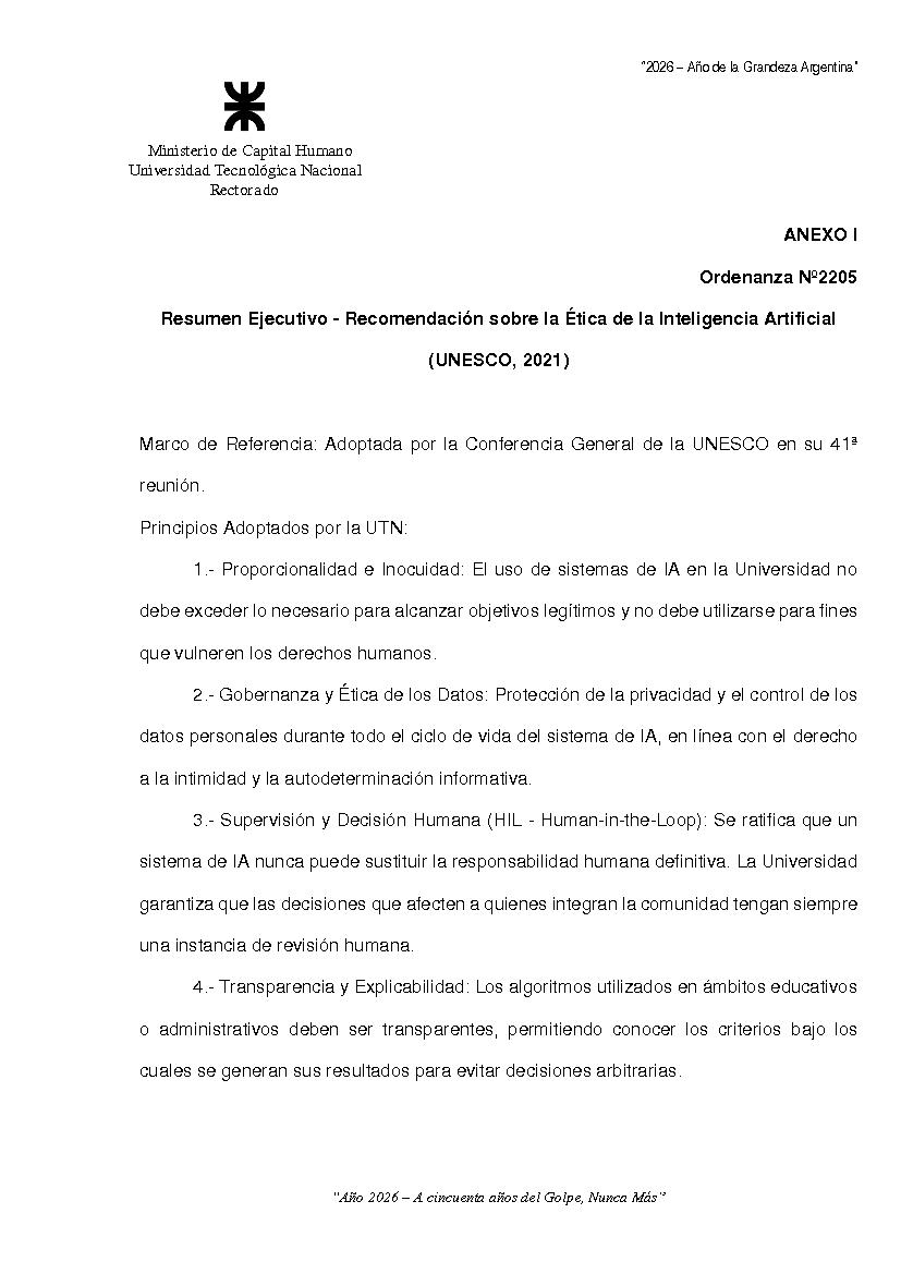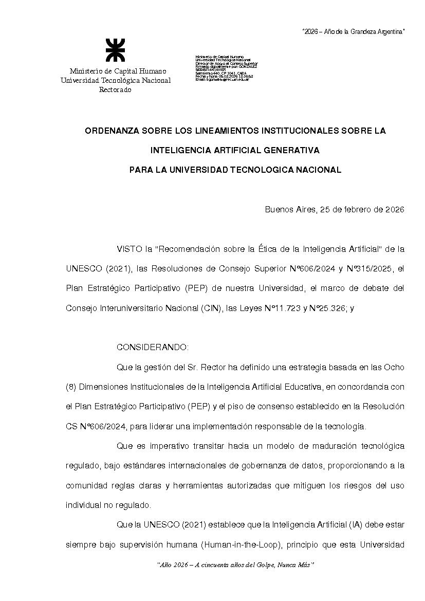 Sitio de la Secretaría Solicitud de Documentos no cargados Iniciar Sesión Ver 1ª parte Ordenanza 2205 de Consejo Superior Categorías Inicio > Interpretación y ReglamentoInicio > Indice > Año 2026 > 1° Reunión Temática: ORDENANZA SOBRE LOS LINEAMIENTOS INSTITUCIONALES SOBRE LA INTELIGENCIA ARTIFICIAL GENERATIVA PARA LA UNIVERSIDAD TECNOLOGICA NACIONAL Fecha: 25/02/2026 Ingrese aquí para Imprimir el Documento