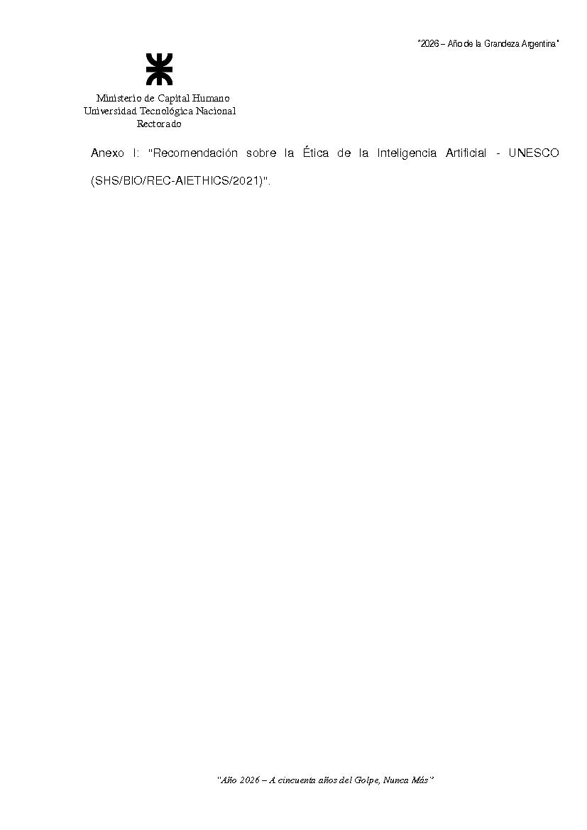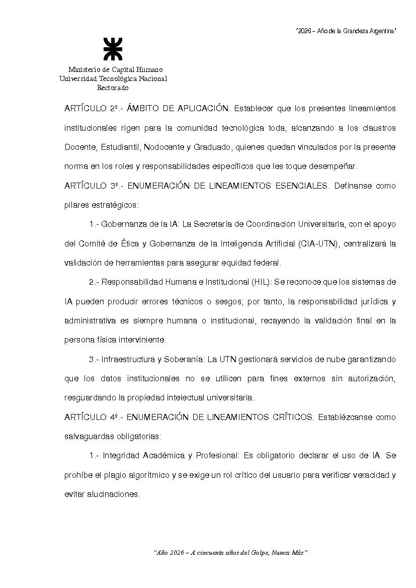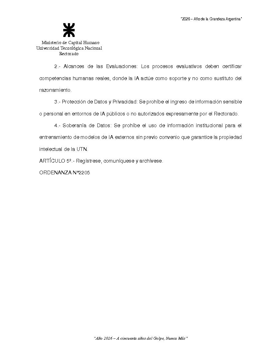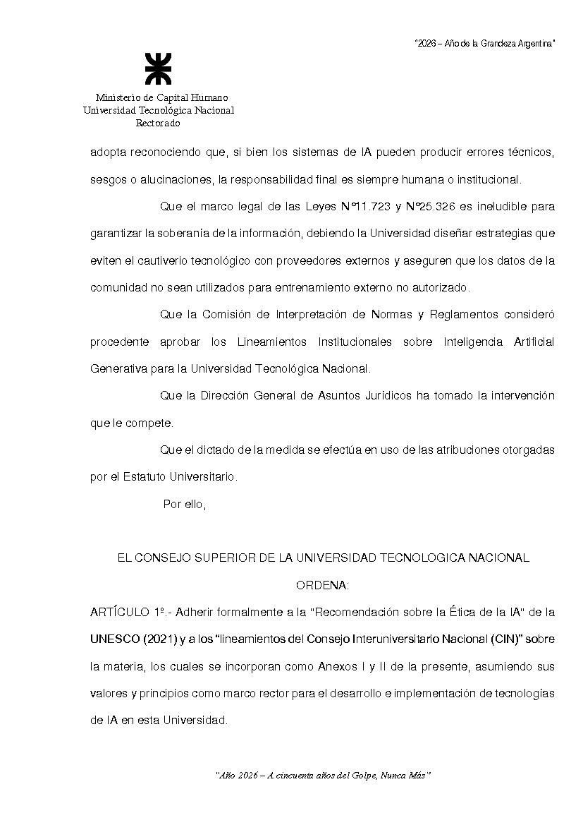 Sitio de la Secretaría Solicitud de Documentos no cargados Iniciar Sesión Ver 1ª parte Ordenanza 2205 de Consejo Superior Categorías Inicio > Interpretación y ReglamentoInicio > Indice > Año 2026 > 1° Reunión Temática: ORDENANZA SOBRE LOS LINEAMIENTOS INSTITUCIONALES SOBRE LA INTELIGENCIA ARTIFICIAL GENERATIVA PARA LA UNIVERSIDAD TECNOLOGICA NACIONAL Fecha: 25/02/2026 Ingrese aquí para Imprimir el Documento