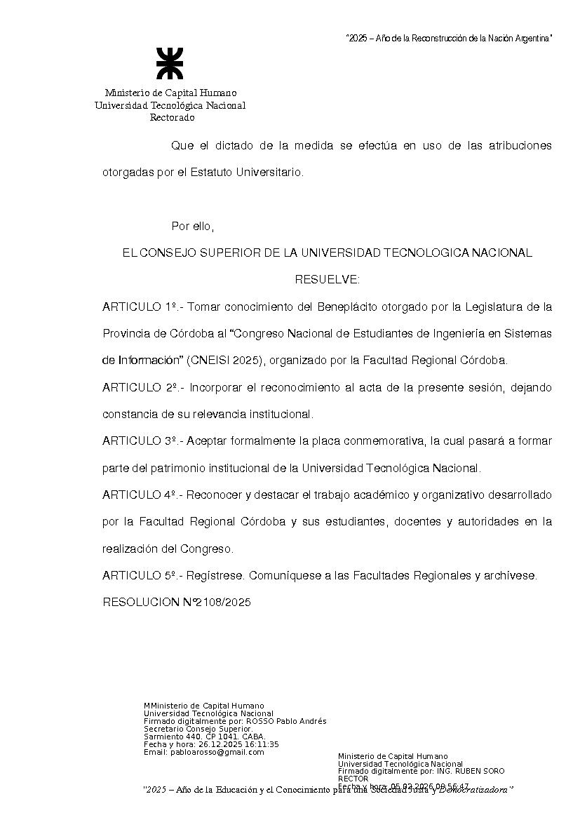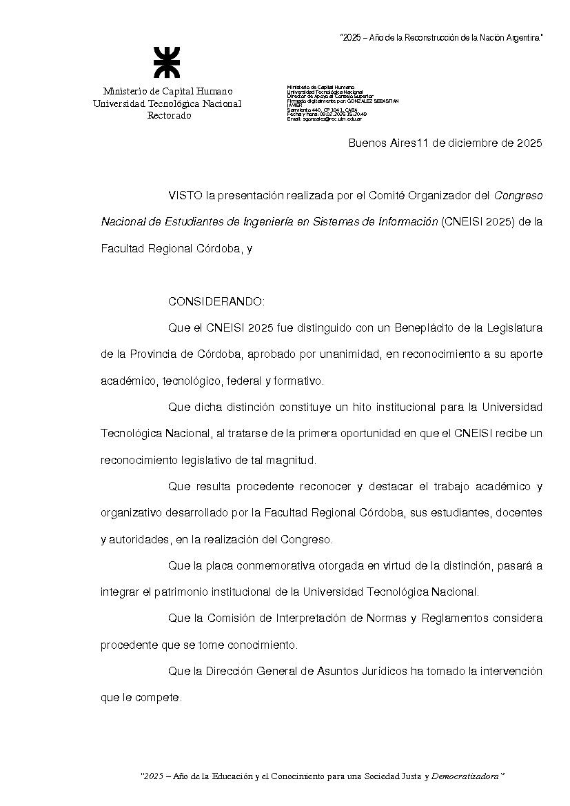 Toma conocimiento del Beneplácito otorgado por la Legislatura de la Provincia de Córdoba al “Congreso Nacional de Estudiantes de Ingeniería en Sistemas de Información” (CNEISI 2025), organizado por la Facultad Regional Córdoba.